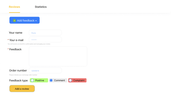 Complaint – select this option if you do not receive money from the exchanger or want to report a fraud. Make sure you specify the exchange application number to speed up the solution of the problem. Your feedback will be highlighted in red in the feedback list below.