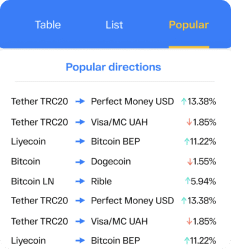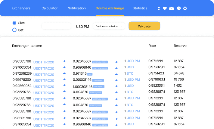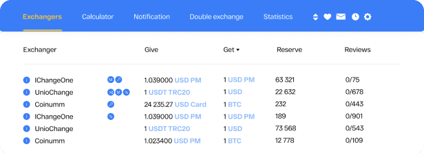 At Changelist.io , you can not only compare rates from various exchangers and choose the best one among them, but also select exchangers for a double exchange if the direct exchange between the currencies is unavailable at the moment.