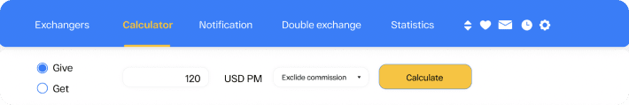 After you select the source and target currencies, you can immediately calculate how much money you will get or how much money you need to exchange to get a certain sum (Fig. 5). To do it, click the Calculator tab, select the Give or Get option, enter the sum, select the Without PS commissions or With PS commissions option (this option determines whether the commissions of the payment systems should be taken into account when the exchange sum is calculated) and click the Calculate button.